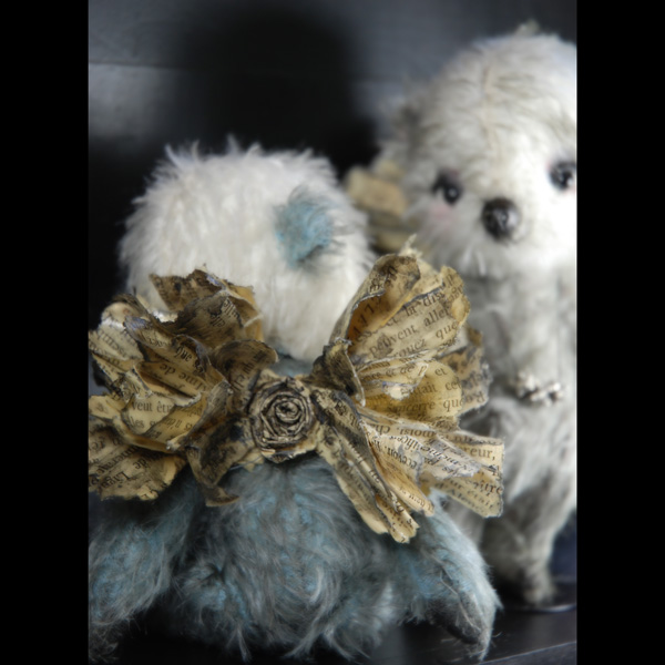 'Emmaline la Fée' is a 6.5" French inspired fairy bear. She is created out of white and smoky blue sparse mohair, a "haute shabby" bear. Sculpted clay nose (no molds,free hand), leather eye lids, needle felted eye whites, glass eyes, hand sewn, center seam head design, hand pigment shaded, stuffed with poly and copper shot for a cozy weight in the hand. Her arms and legs are thread jointed and her head is wobble jointed for lots of movement. She wears a french text, hand painted, altered art fairy wings and wears aurora borealis Swarovski crystals and sterling silver beads around her neck for a bit of la de da' flair. Her eyes are accented in shades of blue and pink with applied eyelashes. Her paw pads have been treated for a wet/worn/shabby texture for a "well loved" appeal.'Emmaline la Fée' is the third in a series of French inspired fairy bears. Thanks for looking at 'Emmaline la Fée'.
