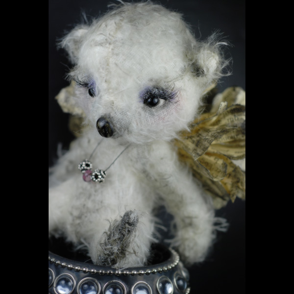 'Fayette la Fée' is a 6.5" French inspired fairy bear. She is created out of white sparse, matted mohair, a "haute shabby" bear. Sculpted clay nose (no molds,free hand), leather eye lids, needle felted eye whites, doe eye design with glass eyes , hand sewn, center seam head design, hand pigment shaded, stuffed with poly and copper shot for a cozy weight in the hand. Her arms and legs are thread jointed and her head is wobble jointed for lots of movement. She wears a french text, hand painted, altered art fairy wings and wears an amethyst bead and sterling silver beads around her neck for a bit of la de da' flair. Her eyes are accented in shades of lavender and pink with applied eyelashes. Her paw pads have been treated for a wet/worn/shabby texture for a "well loved" appeal.