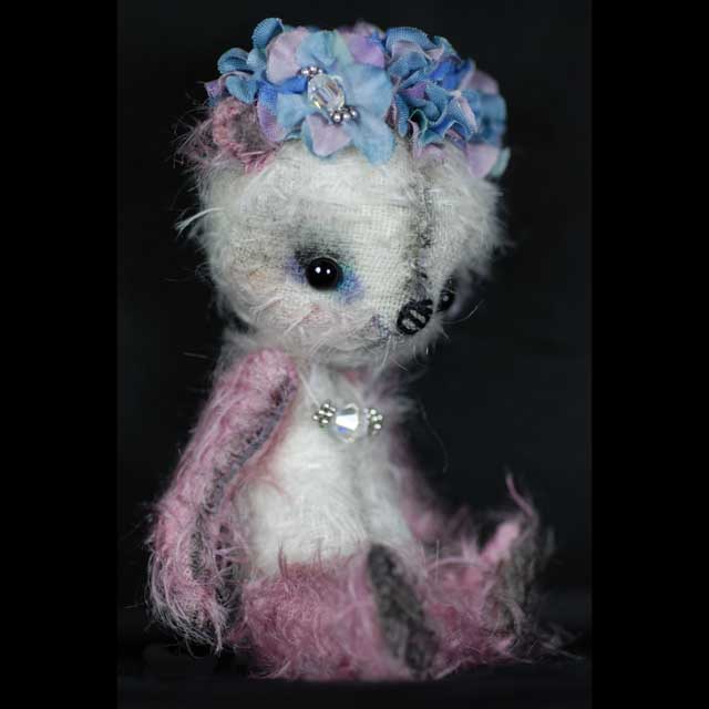 'Kylie Daffyslove' is a tiny 4.25" La De Da' Bear in the NEW 'Mon Petit Bijou' (My Petite Jewel) Collection. She is created in a matted, sparse, cream and hand dyed grape colored mohair. She has been treated and hand tinted/painted in multiple shades of grey, blush and lavender and blue pigments then blended for a watercolor effect around the eyes/cheek area and for an aged, vintage appeal throughout the body. She is very well loved, plucked, weathered and worn to look like a bear from yester-year. Hand sewn, center seam head design, stuffed with poly and natural crushed minerals for a cozy weight in the hand. "Worn off by love" looking embroidered nose and painted mouth and eye detail. Her arms and legs are thread jointed and her head is wobble jointed for movement making her nod more for a shy, "pick me up" appeal. She wears faux lavender flowers embellished with sterling silver beads and Swarovski, Aurora Borealis Crystal beads as flower stamens on her head for a bit of la de da' flair. She also wears the same beads around her neck. She can not stand on her own but can be propped. All of my designs are one of kind, no two bears are alike. From my heart to your hand....I hope the La De Da' Bears bring you a smile. ~ Thanks for looking at 'Kylie Daffyslove'! ~ She is a commission piece for a sweet little girl in New Mexico.