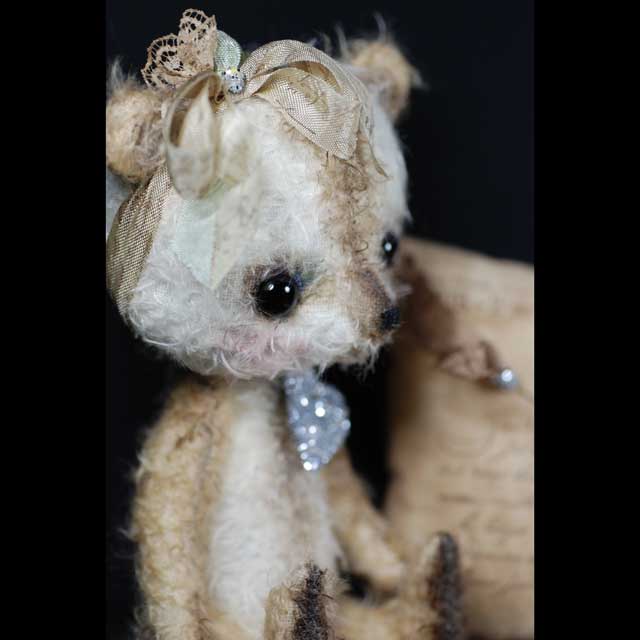She has a petite embroidered nose and painted mouth and eye detail. Her ears are "chubby" and stuffed for a round full effect. Her arms and legs are thread jointed and her head is wobble jointed for movement making her nod more for a shy, "pick me up" appeal. She wears a wonderful hand embellished ephemera bit of lovely textured ribbon with french text and lace, a glittered hat pin on her head for a bit of la de da' flair. She also wears a Marie Antoniette inspired glittered heart on her chest which is removable. She can not stand on her own but can be propped. She also comes with her vintage looking Parisian letter envelop pillow which matches her coloring perfectly.