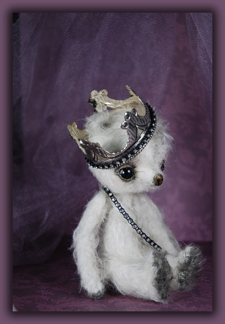 'Prince Beauregard Weeshy' is a 6.5" mohair La De Da' Boy Bear. Beauregard views the world through premium black glass eyes with hand sculpted clay eyelids (upper and lower). I also sculpt wet tear accents inside of the clay for a watery eye, dimensional and soulful gaze. The clay is sculpted on and around the glass eye before the tear medium is added to build dimension custom to the head shape and eye contour. His nose has also been hand sculpted and stained in multiple colors for a leather-like effect. His petite mouth is painted. The legs/feet are a modified hockey stick design with long arms that hang gracefully and tight to his sides. He is created in a scruffy, combed out matted German mohair in off white which has been tinted in gray and blush pink. His face has been needle sculpted to create a slightly upturned nose featuring a cute profile. He is stuffed with poly, copper shot (belly) and the highest quality lavender buds, imported from Provence, France. Lavender is a La De Da' signature element added to all of my bears to enhance the "hug" experience with a gentle, therapeutic natural scent. Squeezing the buds helps release the scent, so you get a little bit of relaxation with every hug. His ears are chubby and stuffed for a round full effect. The arms and legs are thread jointed and his round head is wobble jointed for movement making him nod more for a shy, "pick me up" appeal. He wears a metal crown embellished with a black chain/rhinestone chain and the same chain drapes across his chest for a royal bit of la de da' flair. He can not stand on his own but can be propped. All of my designs are one of kind, no two bears are alike. From my heart to your hand....I hope the La De Da' Artisan Bears bring you a smile.