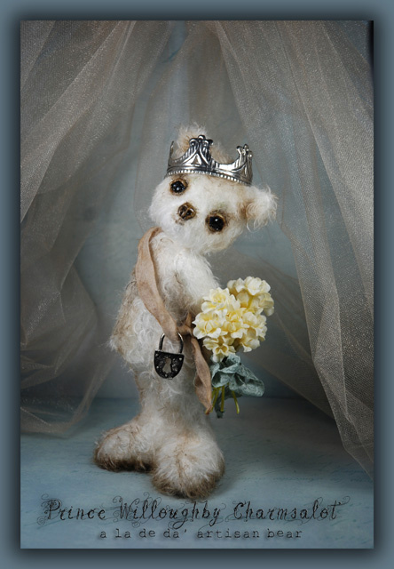 'Prince Willoughby Charmsalot' is a 9.5" mohair La De Da' romantic man bear. Prince Willoughby views the world through premium glass eyes with hand sculpted clay eyelids (upper and lower) accented with sculpted wet tear accents for a dimensional and soulful gaze. The clay is sculpted around the glass eye and into the mohair before the tear medium is added to build dimension custom to the head shape and eye contour. His nose has also been hand sculpted and stained in multiple colors for a leather-like effect. His smile is painted. He is created in a cream color German mohair tinted in multiple shades of coffee, clay, gray and a touch of green. He is stuffed with poly, copper shot (belly and feet) and the highest quality lavender buds, imported from Provence, France. Lavender is a La De Da' signature element added to all of my bears to enhance the "hug" experience with a gentle, therapeutic natural scent. Squeezing the buds helps release the scent, so you get a little bit of relaxation with every hug. His ears are chubby and stuffed for a round full effect. His arms and legs are disk jointed and his head is wobble jointed for movement to create different expressions. He wears a stamped metal crown on his head and a coffee colored, shabby royalty sash embellished with a silver tone lock as a symbol of his waiting for the right key from his princess to unlock his heart. He also holds a pale yellow faux flower bouquet for his princess for a bit of la de da' flair. He can stand on his own nicely. All of my designs are one of kind, no two bears are alike. From my heart to your hand....I hope the La De Da' Artisan Bears bring you a smile.