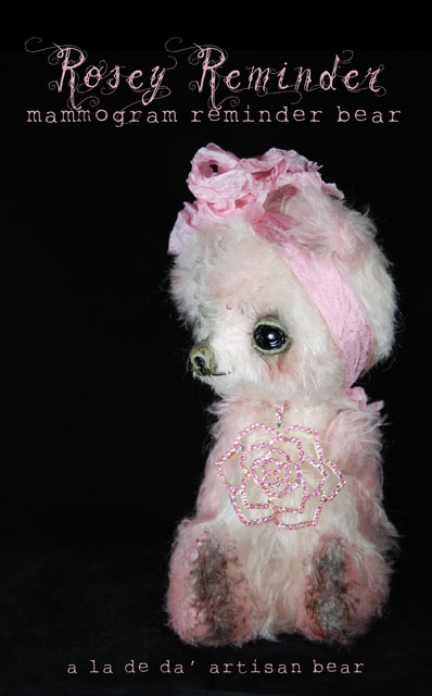 100% OF THE SALE OF THIS BEAR WILL GO TO A WOMAN FOR A MAMMOGRAPHY EXAM. PLEASE REMEMBER TO LOVE YOURSELF AND LOVE AND REMIND ALL THE WOMEN IN YOUR LIFE, BE VIGILANT, GET YOUR SCHEDULED MAMMOGRAMS, SELF EXAMS AND PRAY FOR A CURE. 'Rosey Reminder' is an 8" Mammogram Reminder . La De Da' Artisan Bear. Rosey views the world through shiny black premium glass eyes with meticulously hand sculpted eyelids (upper and lower) accented with sculpted wet tear accents for a dimensional and soulful gaze. The clay is sculpted around the glass eye and into the mohair before the tear medium is added to build dimension custom to the head shape and eye contour. The pool of tears creates a life like element to the eyes and is a La De Da' signature design element. Her nose has also been hand sculpted and stained in multiple colors for a leather-like effect. The sculpting around the eyes creates a truly one of a kind expression to each bear as no two sculpts are ever alike. Her mouth is embroidered and treated to shine ever so slightly. Her legs/feet are a modified hockey stick design with long arms that hang gracefully and tight to her sides. She is created in a feathery plush hand dyed, two tones of blush pink German mohair. She has been treated and hand tinted/painted in gray and pink. Her head is a center seam head design. Her face has been needle sculpted to create a slightly upturned nose featuring a cute profile. She is stuffed with poly, copper shot (belly) and the highest quality lavender buds, imported from Provence, France. Lavender is a La De Da' signature element added to all of my bears to enhance the "hug" experience with a gentle, therapeutic natural scent. Squeezing the buds helps release the scent, so you get a little bit of relaxation with every hug. She is a lovely weight, under one pound. Her ears are chubby and stuffed for a round full effect. Her arms, legs and head are disk jointed. I hand dyed the vintage ribbon on her head and she wears a pretty pink crystal rose pendant around her neck for a bit of la de da' flair. She can not stand on her own but can be propped. All of my designs are one of kind, no two bears are alike. From my heart to your hand....I hope the La De Da' Bears bring you a smile.