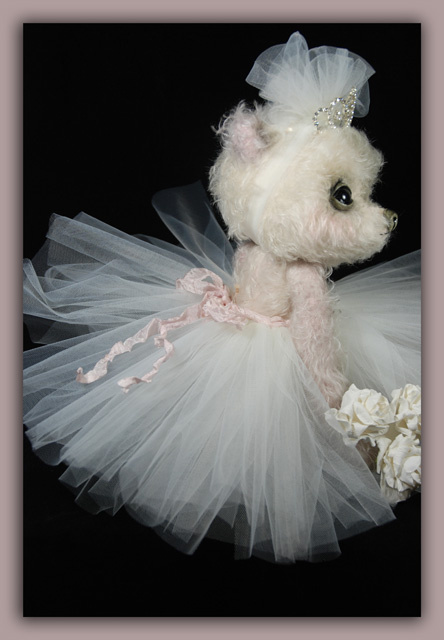 'Crystal LaBallerine' is the second 21" teary eyed mohair La De Da' Artisan Bear. Crystal views the world through shiny black premium glass eyes with hand sculpted clay eyelids (upper and lower) accented with sculpted wet tear accents for a dimensional and soulful gaze. They are filled with tears on the lower part of the eye giving a lifelike, forlorn expression. The clay is sculpted around the glass eye and into the mohair before the tear medium is added to build dimension custom to the head shape and eye contour. Her nose has also been hand sculpted and stained in multiple colors for a leather-like effect. Her mouth is embroidered and treated to shine ever so slightly. Her long legs are needle sculpted with a bent knee for cute posing possibilities. She has pointed toes like a ballerina. Her long arms hang gracefully and tight to her sides. She is created in a hand dyed in two tones of a dusty muted pink in a feathery soft, 1" wavy German mohair, tinted in gray and blush. Center seam head design. Her face has been needle sculpted to create a slightly upturned nose featuring a cute profile. She is stuffed with poly, mineral stones (belly) and the highest quality lavender buds, imported from Provence, France. Lavender is a La De Da' signature element added to all of my bears to enhance the "hug" experience with a gentle, therapeutic natural scent. Squeezing the buds helps release the scent, so you get a little bit of relaxation with every hug. She weighs over 1.5 pounds and feels really nice in your arms for sweet hugs. Her ears are chubby and stuffed for a round full look. Her arms,legs and head are disk jointed. She wears a very grand ivory hand made tulle tutu and a very sprarkly rhinestone crown on her head for a bit of la de da' flair. She can not stand on her own but can propped or used in a doll stand. All of my designs are one of kind, no two bears are alike. From my heart to your hand....I hope the La De Da' Artisan Bears bring you a smile.