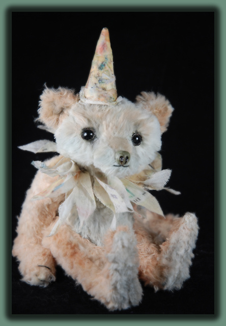 Handsome 'Sir Crawley Sweetfellow' is an 8 inch(20.3 centimeters)hand sewn and painted La De Da' Artisan Bear. FACIAL FEATURES Sir Crawley Sweetfellow views the world through shiny black premium glass eyes with hand sculpted clay eyelids, accented with the La De Da' signature wet tear accents for a dimensional and soulful gaze. The lower eyelids are filled with a tear medium giving a wet, lifelike, forlorn expression. The nose has also been hand sculpted,stained and glossed for natural effect. The mouth is embroidered and treated to shimmer. BODY He is five way jointed and is created in a feathery soft Helmbold viscose. The entire body is meticulously painted and heat set in a textile watercolor, leaving the hand of the viscose very soft. He is painted in pale carmel and dove gray. He was sewn entirely by hand and is stuffed with poly, copper shot for weight and the highest quality lavender buds in the belly. He is an old style design with very long hockey stick arms and legs. His snout is long and his neck joint is wobble jointed for a more "nodding", vintage posture. The lavender is imported from Provence, France. Lavender is a La De Da' signature element added to all of my bears to enhance the "hug" experience with a gentle, therapeutic natural scent. Squeezing the buds helps release the scent, so you get a little bit of relaxation with every hug. In addition, non-culinary Lavender is a natural repellent to moths, insects and other critters, like mice, helping preserve and protect your La De Da' bear for many years. ACCESSORIES He wears a hand designed shabby collar for a bit of la de da' flair. It is made in a delicate voile, custom printed with my own ephemera artwork for interest, uniqueness and texture. I also fashioned a removable coordinating cone hat for a bit of whimsy. He can not stand on his own but can propped. All of my designs are one of kind, no two bears are alike. From my heart to your hand....I hope the La De Da' Artisan Bears bring you a smile.