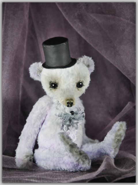 Handsome 'Sir Rutherford Le Genteel' is an 8.5" inch (9" with hat) hand sewn and painted La De Da' Artisan Bear. FACIAL FEATURES 'Sir Rutherford Le Genteel' views the world through shiny black premium glass eyes with hand sculpted clay eyelids, accented with the La De Da' signature wet tear accents for a dimensional and soulful gaze. The lower eyelids are filled with a tear medium giving a wet, lifelike, forlorn expression. The nose has also been hand sculpted,stained and glossed for natural effect. The mouth is embroidered and treated to shimmer. BODY He is five way jointed and is created in a feathery soft Helmbold viscose. The entire body is meticulously painted and heat set in a textile watercolor, leaving the hand of the viscose very soft. He is painted in pale lavender and soft gray. He was sewn entirely by hand and is stuffed with poly, copper shot for weight and the highest quality lavender buds in the belly. He is an old style design with very long hockey stick arms and legs. His snout is long and his neck joint is wobble jointed for a more "nodding", vintage posture. The lavender is imported from Provence, France. Lavender is a La De Da' signature element added to all of my bears to enhance the "hug" experience with a gentle, therapeutic natural scent. Squeezing the buds helps release the scent, so you get a little bit of relaxation with every hug. In addition, non-culinary Lavender is a natural repellent to moths, insects and other critters, like mice, helping preserve and protect your La De Da' bear for many years. ACCESSORIES He wears a hand designed shabby ascot accented with a black bead faux tie tack for a bit of la de da' flair. It is made in a delicate voile with pleats and lace, custom printed with my own Parisian ephemera artwork for interest, uniqueness and texture. I also fashioned a paper clay top hat for a bit of whimsy. He can not stand on his own but can propped. All of my designs are one of kind, no two bears are alike. From my heart to your hand....I hope the La De Da' Artisan Bears bring you a smile.