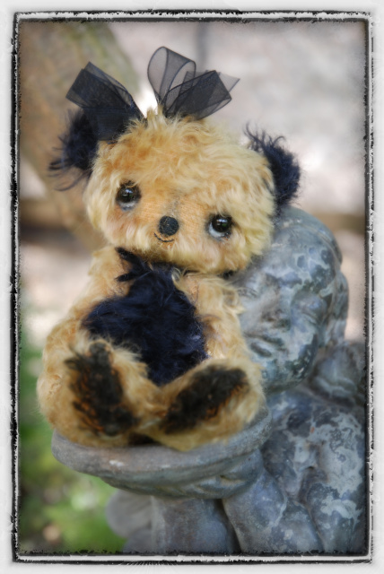 She is five way jointed and is created in a curly/dense/gold and dense/curly/jet black mohair. She was sewn entirely by hand, (no machine sewing) and is stuffed with poly, and copper shot and the highest quality lavender buds in the belly.