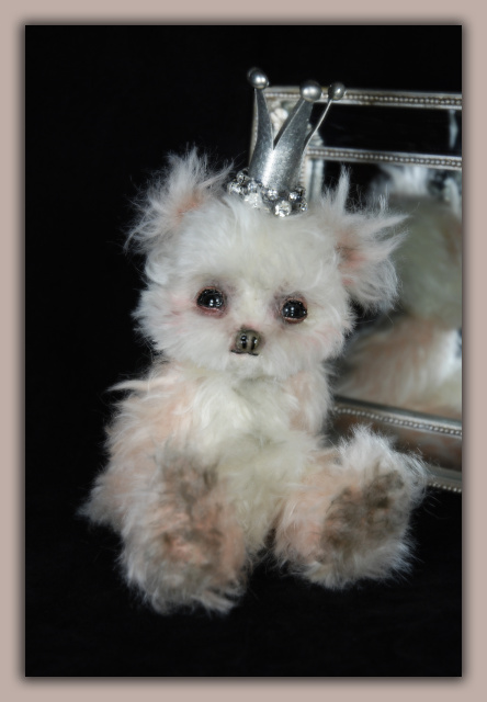 'Princesse de Bébé' is a 7" (17.7 centimeters) (9" with crown) teary eyed, clay sculpted detail, hand sewn La De Da' Artisan Bear. FACIAL FEATURES 'Princesse de Bébé' views the world through shiny black premium glass eyes with hand sculpted clay eyelids, accented with the La De Da' signature wet tear accents for a dimensional and soulful gaze. The lower eyelids are filled with a tear medium giving a wet, lifelike, forlorn expression. The nose has also been hand sculpted,stained and glossed for natural effect. The mouth is embroidered and treated to shimmer slightly. BODY She is five way jointed and is created in a dense pale petal pink and shaggy white mohair. She was sewn entirely by hand, (no machine sewing) and is stuffed with poly, and copper shot and the highest quality lavender buds in the belly. The lavender is imported from Provence, France. Lavender is a La De Da' signature element added to all of my bears to enhance the "hug" experience with a gentle, therapeutic natural scent. Squeezing the buds helps release the scent, so you get a little bit of relaxation with every hug. In addition, non-culinary Lavender is a natural repellent helping preserve and protect your La De Da' Artisan Bear for many years. ACCESSORIES 'Princesse de Bébé' wears a metal crown with rhinestones around the base on her head for a bit of la de da' flair. I have sewn a bit of foam on her head to hold the crown in a secure way so it does not topple over. All of my designs are one of kind, no two bears are alike. From my heart to your hand....I hope the La De Da' Artisan Bears bring you a smile.