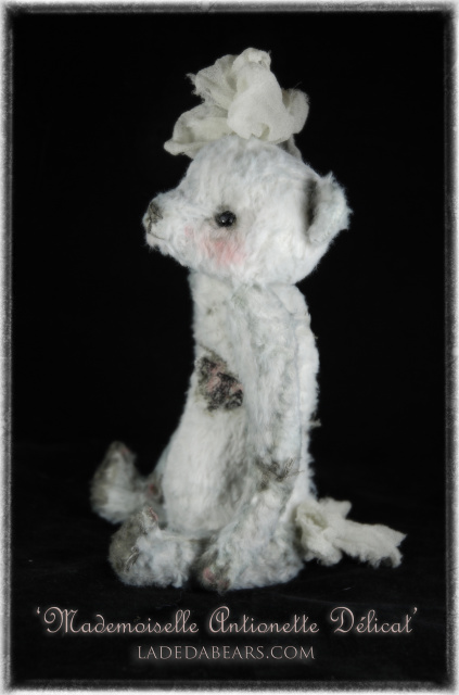'Mademoiselle Antionette Délicat' is a 9" (22.8 centimeters) hand sewn Tender Echoes ~ La De Da' Artisan Bear. FACIAL FEATURES 'Mademoiselle Antionette Délicat' views the world through black premium glass eyes that have been distressed for a worn/aged look. Her face has also been needle sculpted for depth and character. Her cheeks are rouged adding to her la de da' appeal. The nose has also been loosely stitched, purposely tattered for a well loved appearance. BODY She is five way jointed and is created in a multi-distressed/baked/shaded viscose hand dyed in two tones of muddled dove gray. She is the first in this new body design with longer arms and a fuller belly. She was sewn entirely by hand, (no machine sewing) and is loosely stuffed with poly, copper shot and the highest quality lavender buds in the belly. Her arms have been weighted with shot for an even more substantial weight. She can not stand on her own but can be propped. Most of her torso is filled with French Lavender and feels and sounds crunchy like an old bear. She is "shlumpy" in the middle where you can move around the combination of stuffing to pose her in different ways. The lavender is imported from the Mont Ventoux region of Provence, France. Lavender is a La De Da' signature element added to all of my bears to enhance the "hug" experience with a gentle, therapeutic natural scent. Squeezing the buds helps release the scent, so you get a little bit of relaxation with every hug. In addition, non-culinary Lavender is a natural repellent helping preserve and protect your La De Da' Artisan Bear for many years. DETAILS 'Mademoiselle Antionette Délicat' wears a sewn-in silk bow embellished with sweet vintage buttons on her head. She also wears a signature La De Da' Tender Echoes mohair heart patch over her own heart and silk bow on her little tush. Throughout her body, she is displays her "life stripes" of mended stitches and loose threads. All of my designs are one of kind, no two bears are alike. From my heart to your hand....I hope the La De Da' Artisan Bears bring you a smile. May God bless you always.