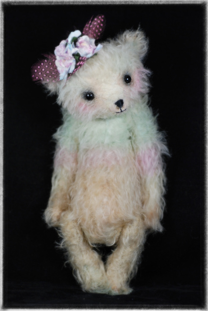She is five way jointed and is created in a multi-distressed/baked semi sparse mohair. It is then meticulously hand painted in a textile medium in an ombre effect from tan to pale pink to a Tiffany Box blue. The painting occurs on both the front and back of the body. She was sewn entirely by hand, (no machine sewing) and is loosely stuffed with poly, copper shot and the highest quality lavender buds in the belly. Her arms have been weighted with shot for an even more substantial weight. She can not stand on her own but can be propped. Most of her torso is filled with French Lavender and feels and sounds crunchy like an old bear. She is "shlumpy" in the middle where you can move around the combination of stuffing to pose her in different ways.