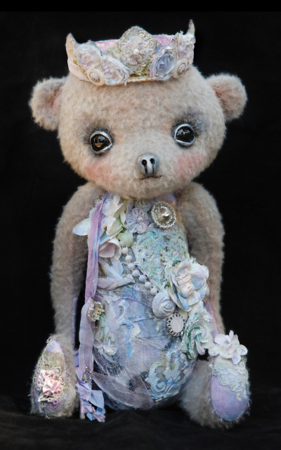 'Sweet Princess Floressa' is a 17" La De Da Assemblage Art Bear. Her mohair is a short, nubby vintage style in a dove gray color. Her art canvas torso and foot pads have been heavily textured in many mixed media elements and an Assemblage of which include a metal bird, Victorian heart, crowns and doll face sculpted by me, various beads, buttons, ribbon, flowers and other texture elements. The entire look is very 'haute shabby'. Her crown is of the same elements topping her off... royally. Her head is very large with big exaggerated eyes with long lashes. She can not stand.