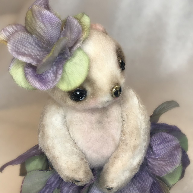 'Precious Wee Violette' is a 3.5" (4" on her toes) Teary Eyed Mini Bear by La De Da' Artisan Bears © FROM THE TOP 'Precious Wee Violette' views the world through shiny, black, hand crafted German glass eyes, surrounded by my sculpted signature upper and lower eyelids filled with wet looking tears. Her nose has also been sculpted freehand. BODY She is wired in the torso and limbs and can pose in many ways, including pointed toes. She is created in a faux fur from France which has been dyed, painted and shaded in textile friendly pigments. She was sewn entirely by hand by the artist, Brenda Pollock, in hundreds of tiny stitches and is firmly stuffed with 100% virgin polyester. DETAILS 'Precious Wee Violette' wears a skirt made of faux flower petals with a matching fascinator on her wee head very much in the La De Da'© style. She has a tiny loop "tail" which attaches to her antiqued and custom designed display stand, also crafted by Brenda to enable her to pose in unlimited options. CARE INSTRUCTIONS Please keep your new bear from water, steamy bathrooms, moisture, etc. Treat it as you would any fine art, free from sunlight, moisture, etc. All of my designs are one of kind, no two bears are alike. From my heart to your hand....I hope the La De Da' Artisan Bears ©, the original teary eyed bears...make you smile.