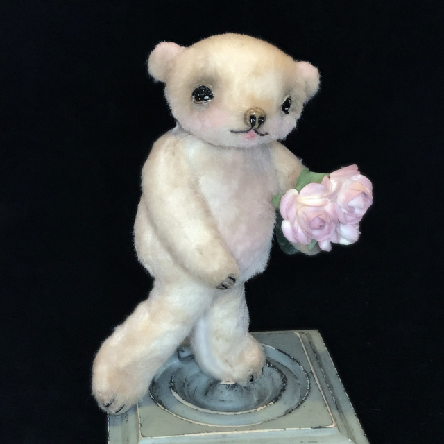 'Precious Korbin' is a 3.5" Teary Eyed Mini Bear by La De Da' Artisan Bears © FROM THE TOP 'Precious Korbin' views the world through shiny, black, hand crafted German glass eyes, surrounded by my sculpted signature upper and lower eyelids filled with wet looking tears. His nose has also been sculpted freehand. BODY He is wired in the torso and limbs and can pose in many ways, including pointed toes. He is created in a faux fur from France which has been dyed, painted and shaded in textile friendly pigments. He was sewn entirely by hand by the artist, Brenda Pollock, in hundreds of tiny stitches and is firmly stuffed with 100% virgin polyester. DETAILS 'Precious Korbin' carries a removable bouquet of millinery flowers ..very much in the La De Da'© style. He has a wee "tail" which attaches to his antiqued and custom designed display stand, also crafted by Brenda to enable him to pose in unlimited options. CARE INSTRUCTIONS Please keep your new bear from water, steamy bathrooms, moisture, etc. Treat it as you would any fine art, free from sunlight, moisture, etc. All of my designs are one of kind, no two bears are alike. From my heart to your hand....I hope the La De Da' Artisan Bears ©, the original teary eyed bears...make you smile.