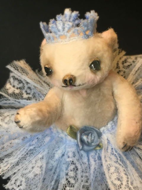 'Precious Perri' is a 4" Teary Eyed Mini Bear by La De Da' Artisan Bears © FROM THE TOP 'Precious Perri' views the world through shiny, black, hand crafted German glass eyes, surrounded by my sculpted signature upper and lower eyelids filled with wet looking tears. The nose has also been sculpted freehand. BODY The body is wired in the torso and limbs and can pose in many ways, including pointed toes, created in a faux fur from France which has been dyed, painted and shaded in textile friendly pigments. This creation was sewn entirely by hand by the artist, Brenda Pollock, in hundreds of tiny stitches and is firmly stuffed with 100% virgin polyester. DETAILS 'Precious Perri' wears a gorgeous hand dyed, periwinkle lace skirt and a hand crafted matching crown, very much in the La De Da'© style. I have crafted a tiny loop "tail" which attaches to the antiqued and custom designed display stand, also designed by Brenda to enable various poses in unlimited options. CARE INSTRUCTIONS Please keep your new bear from water, steamy bathrooms, moisture, etc. Treat it as you would any fine art, free from sunlight, moisture, etc. All of my designs are one of kind, no two bears are alike. From my heart to your hand....I hope the La De Da' Artisan Bears ©, the original teary eyed bears...make you smile.