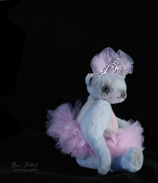 'Mademoiselle Ambroisine' is a new 7" (with tiara) design - Original Teary Eyed Artist Bear by La De Da' Artisan Bears © FROM THE TOP 'Mademoiselle Ambroisine' views the world through shiny, black, hand crafted German glass eyes, surrounded by my sculpted signature upper and lower eyelids filled with wet looking tears. The nose has also been sculpted freehand. BODY This design was created in a bit scruffy, faux fur imported from France which has been dyed, painted and shaded in textile friendly pigments and sewn entirely by hand by the artist, Brenda Pollock, in hundreds of tiny stitches and is firmly stuffed with 100% virgin polyester. The belly has been weighted to give my designs a nice feel in your hand. DETAILS 'Mademoiselle Ambroisine' wears a hand made pale pink tulle tutu and a metal tiara with matching tulle on her head very much in the La De Da'© style. All sewn in. CARE INSTRUCTIONS Please keep your new bear from water, steamy bathrooms, moisture, etc. Treat it as you would any fine art, free from sunlight, moisture, etc. All of my designs are one of kind, no two bears are alike. From my heart to your hand....I hope the La De Da' Artisan Bears ©, the original teary eyed bears...make you smile.